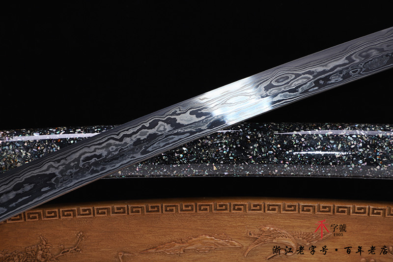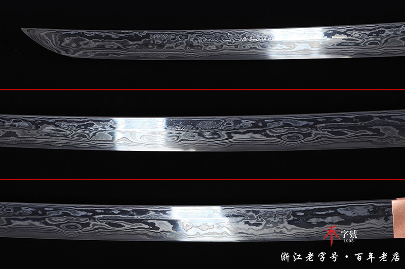 【刃材工艺】 高难度天铁锻造(禾字号代表性传承工艺)+古法三枚合工艺(难上加难),敷土烧刃热处理,手工精细磨,形成禾字号标志性的天铁锻造纹路,非常独特漂亮